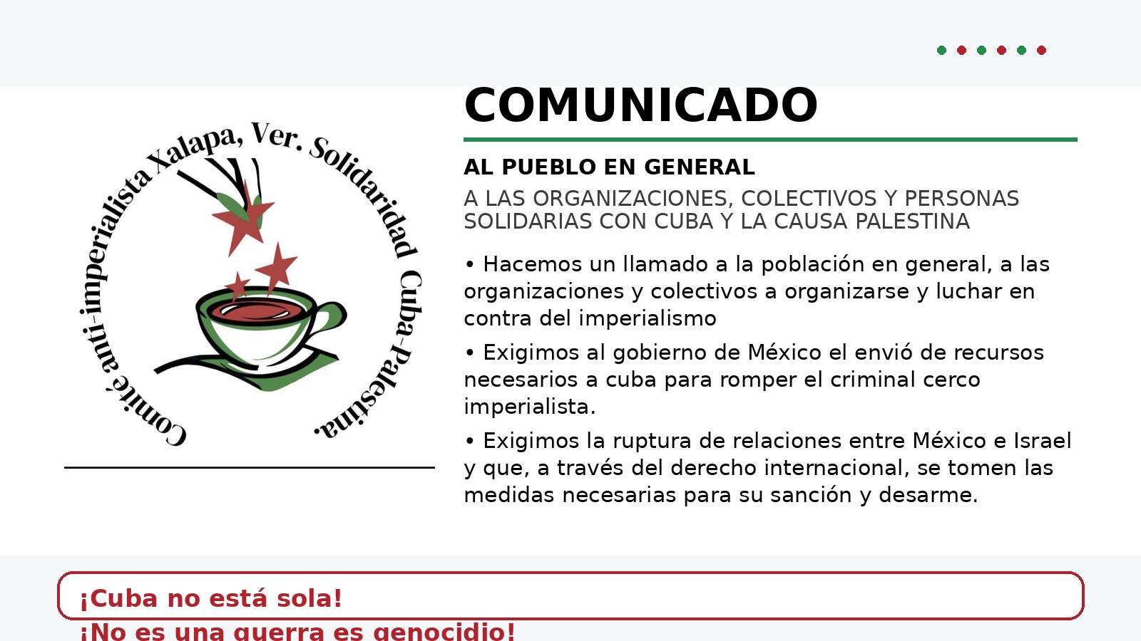 • Exigimos al gobierno de México el envió de recursos necesarios a cuba para romper el criminal cerco imperialista.