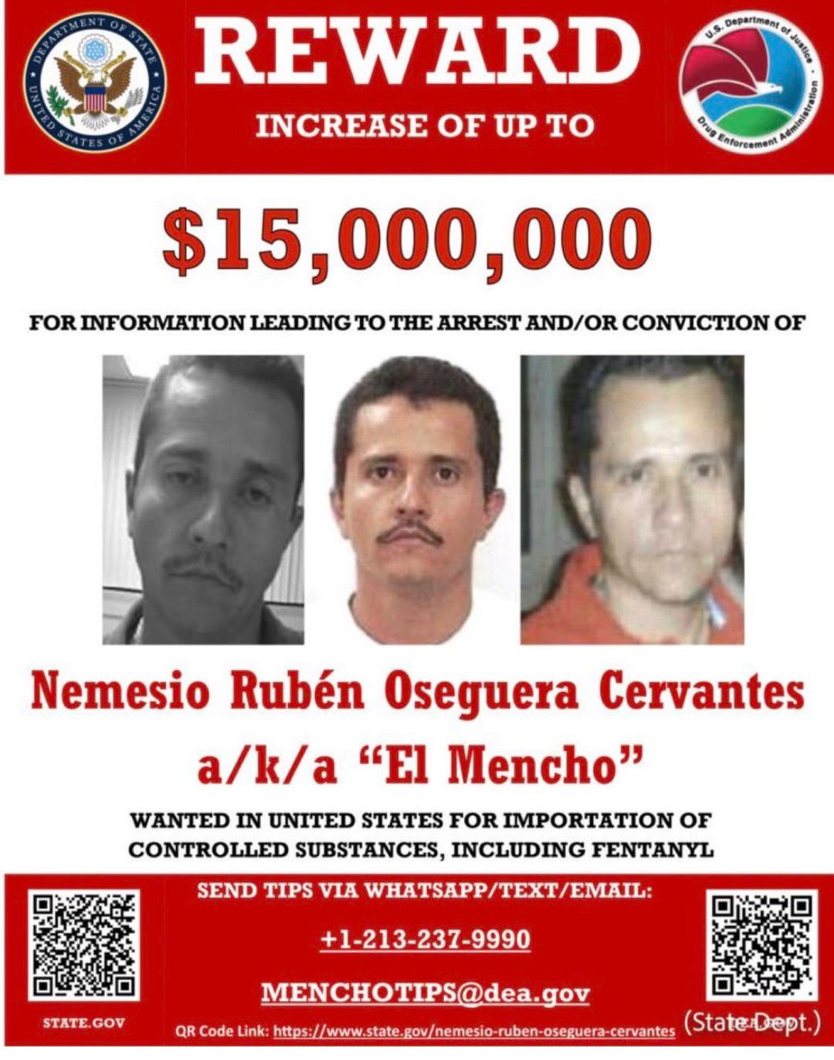 En la ficha de fugitivos de la DEA, “El Mencho” aparecía con recompensa “de hasta 15 millones de dólares” y con referencia a acusaciones federales (narcóticos y armas) radicadas en jurisdicción del Distrito de Columbia.